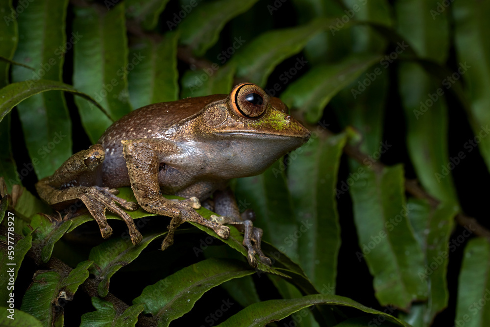 Madagascar wildlife. Madagascar Bright-eyed Frog, Boophis madagascariensis, Ranomafana NP in Madagascar. Endemic amphibian in the forest habitat, night photo. Green leaf with frog.