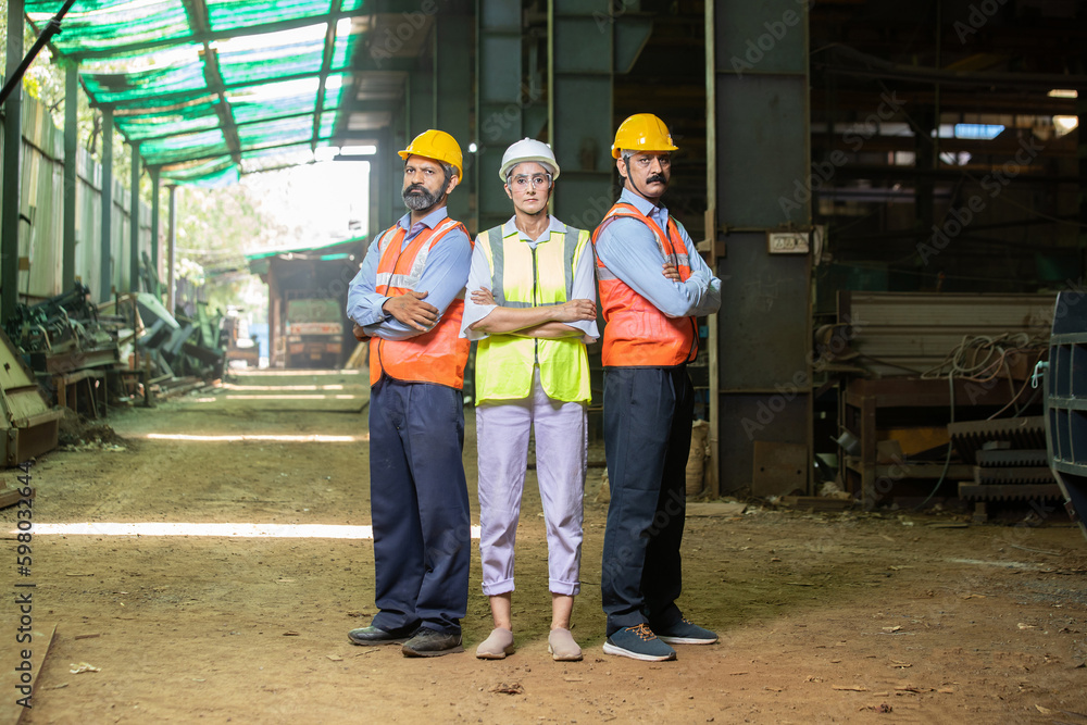 Team of happy confident indian engineers wearing safety hard hat and vest standing at industrial factory, male and female professional workers looking at camera, skill india.