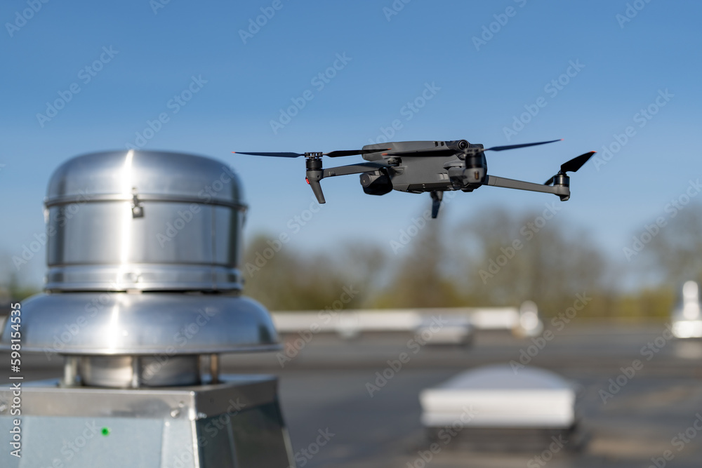 Drone being used to perform an aerial inspecting of HVAC RTU equipment on a commercial roof.
