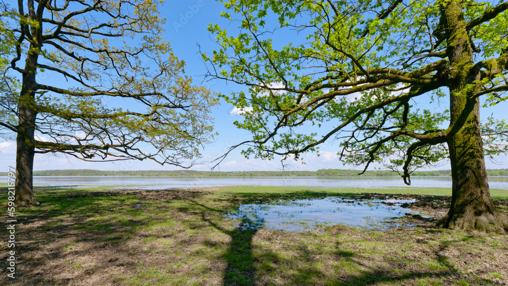 Tranquill view of the trees by the lake shore near the village of Muzilovcica, Lonjsko Polje Nature Park, Croatia