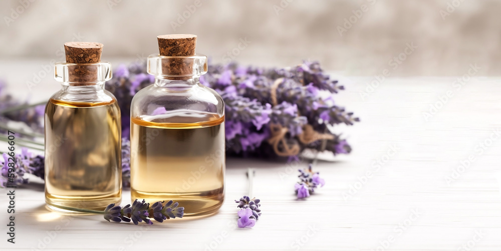 Bottles of essential oil for aromatherapy, alternative medicine or perfumery and a bouquet of fresh lavender on a light abstract background. Side view, close-up.