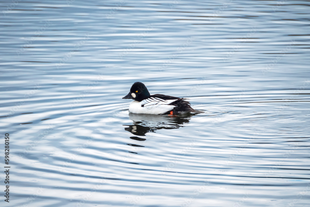 Common Goldeneye swimming in open water. Common Goldeneye, bucephala clangula, portrait against a beautiful blue water background. Concept of the International Day of Birds.