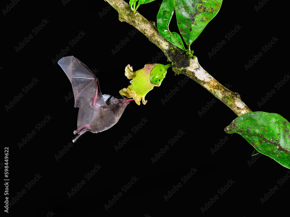 Pallas's long-tongued bat approaching Calabash tree flower at night, drinking nectar, Costa Rica