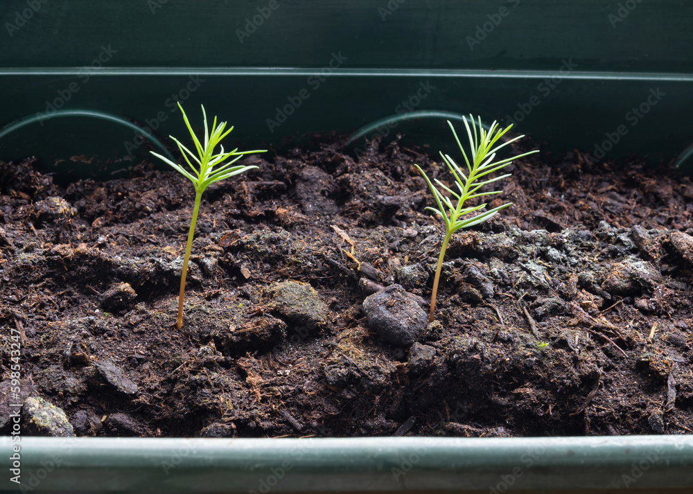 Close up of young sequoia tree seedlings, growing giant sequoia trees from the seed at home