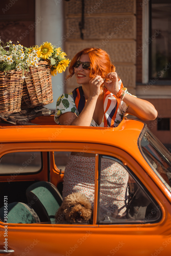 A young beautiful woman in sunglasses stands in a retro convertible car and adjusts her earrings