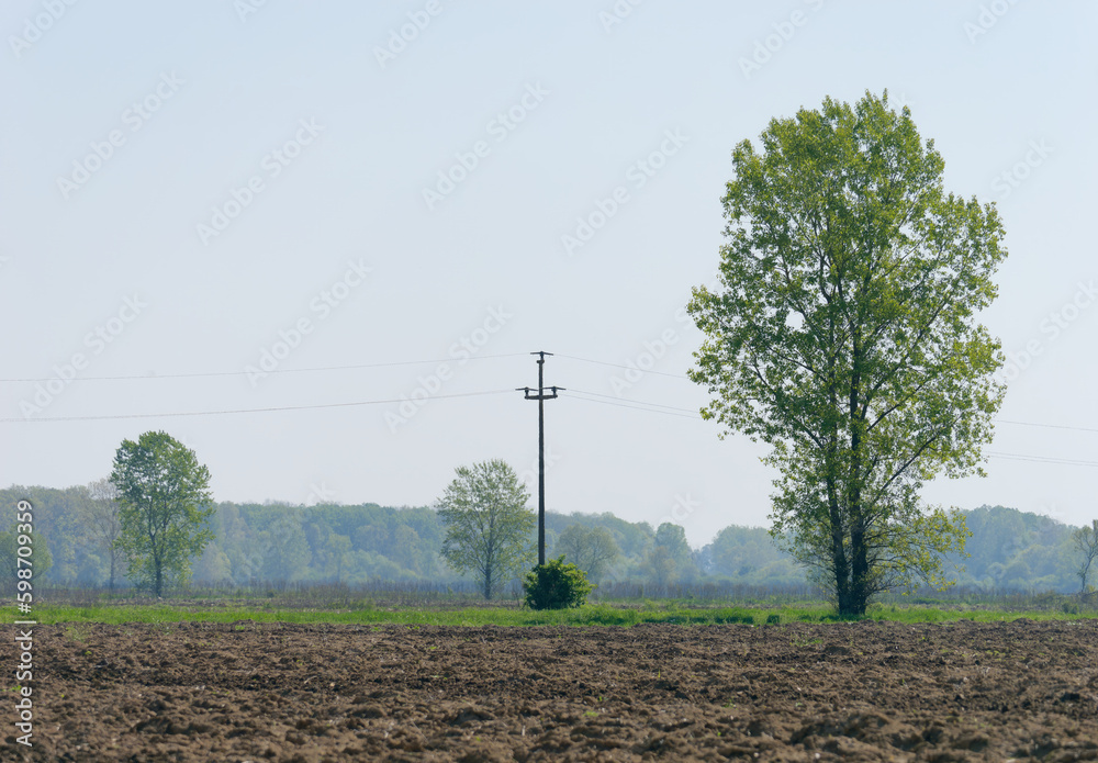 Agricultural field and a wooden electric pole and trees in the background near the village of Krapje, Lonjsko Polje Nature Park, Croatia