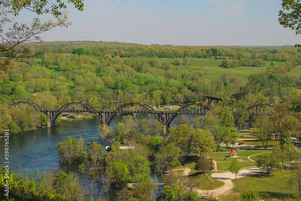 Looking out over the White River and historic Cotter bridge on a beautiful spring day from high up on a bluff in Cotter, Arkansas