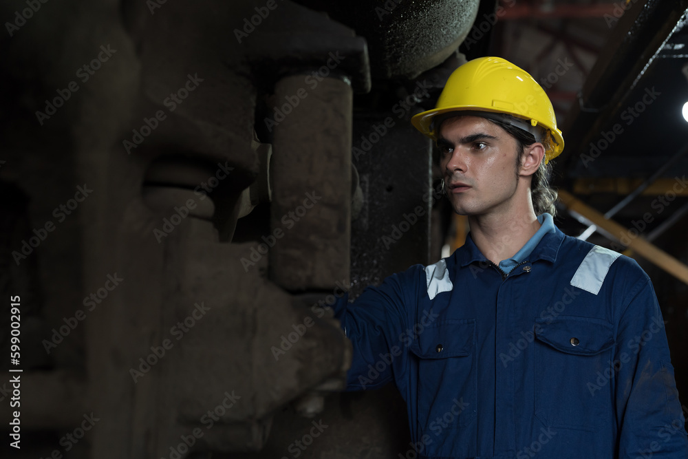 Male engineer worker maintenance locomotive engine. Technician inspecting quality parts of locomotive engine in locomotive garage. Male railway engineer repair engine in garage