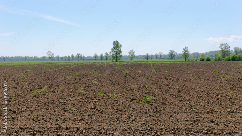 Low-angle view of the agricultural field and a and trees in the background near the village of Krapje, Lonjsko Polje Nature Park, Croatia