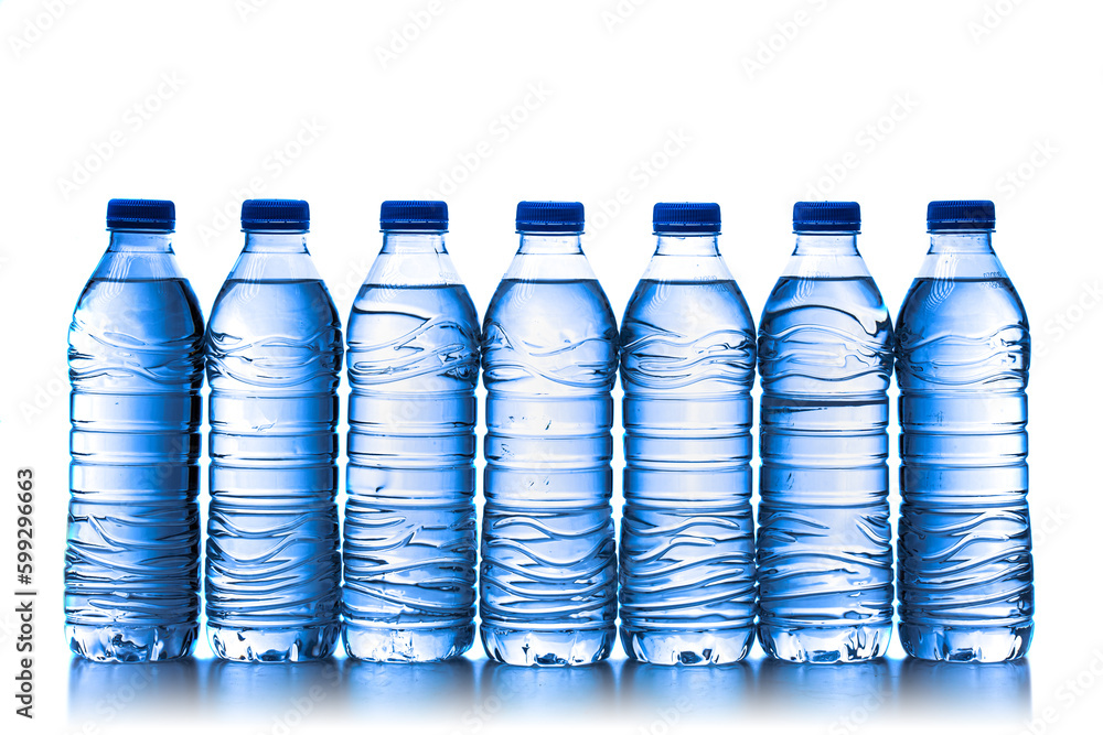 pile of half litre plastic water bottles with blue cap