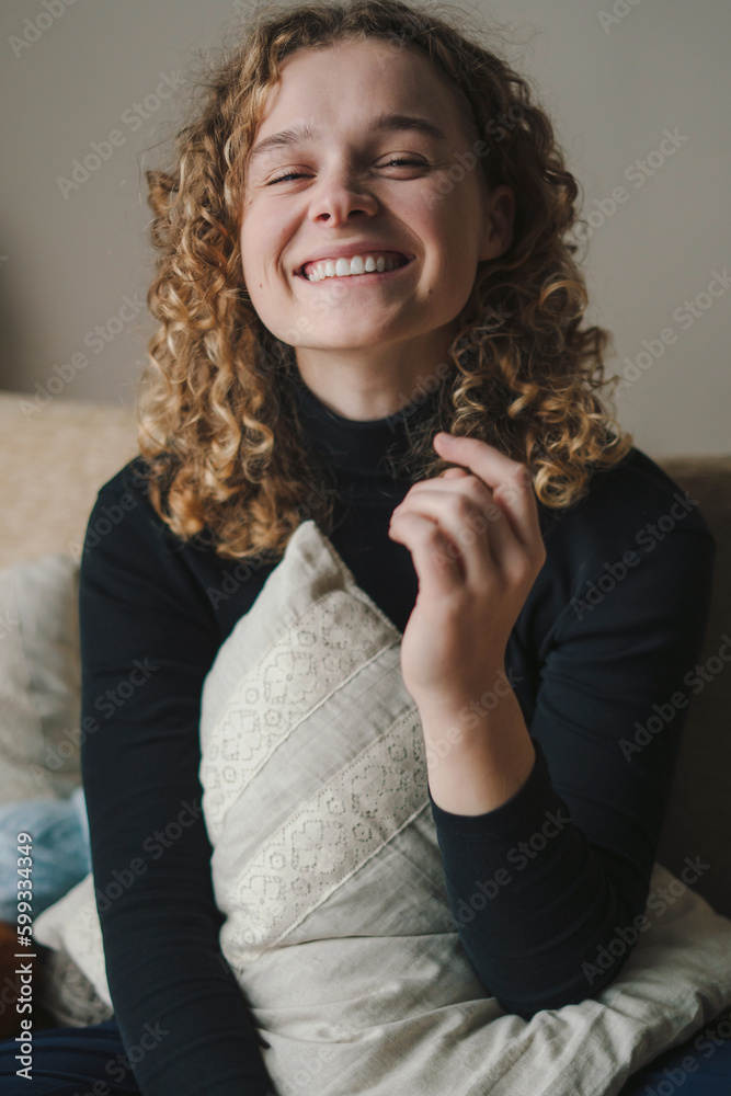 Woman with curly hair sitting on sofa at home looking at the camera and smiling with teeth full-length, hugging pillow, happy home vacations. People lifestyle
