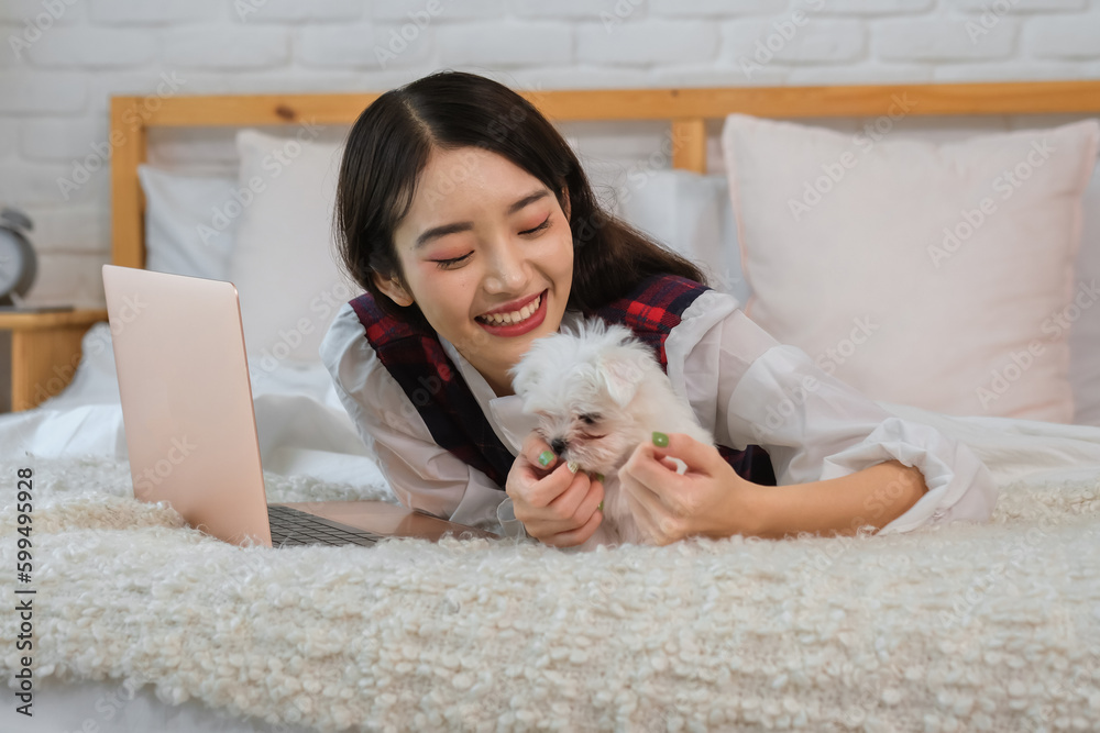 As the beautiful Asian girl works on her laptop she occasionally glances over to the bed where her little friend and the fluffy white dog are cuddled up together.