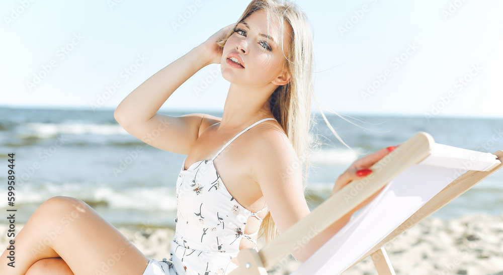 Happy blonde woman wearing sun glasses and relaxing on a wooden deck chair at the ocean beach