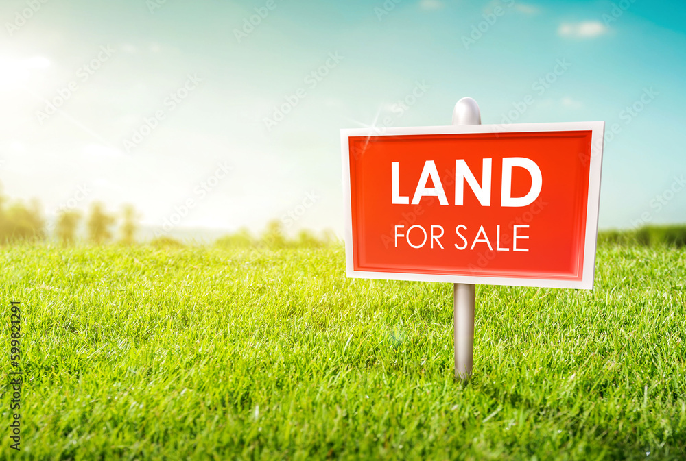 Land plot management - real estate concept with a vacant land on a green field available for building construction and housing subdivision in a residential area for sale, rent, buy or investment.