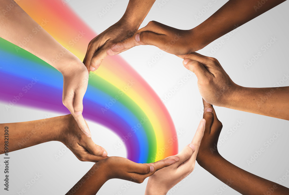 Inspirational idea unity and creative team for creativity thinking together as a diverse group of people together joining hands into the shape of a circle as an ideas concept.