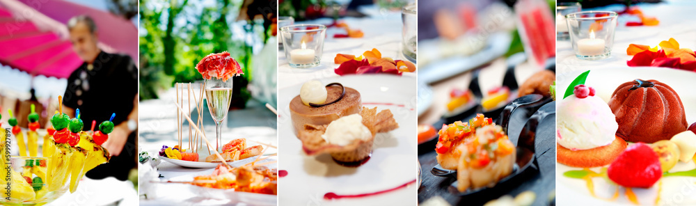 Conjunto de snacks y aperitivos para buffet en exterior. Collage de fotos, concepto de banner para comida en eventos y celebraciones