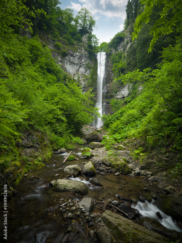 Beautiful waterfall cascade on forest. Maral waterfall in summer season. Eastern black sea forests Karcal mountains. Maralkoy, Borcka district, Artvin city, Turkey