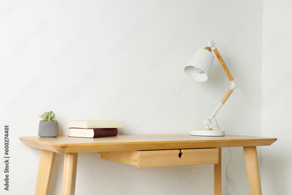 Stylish lamp, books and houseplant on wooden table near white wall. Interior design