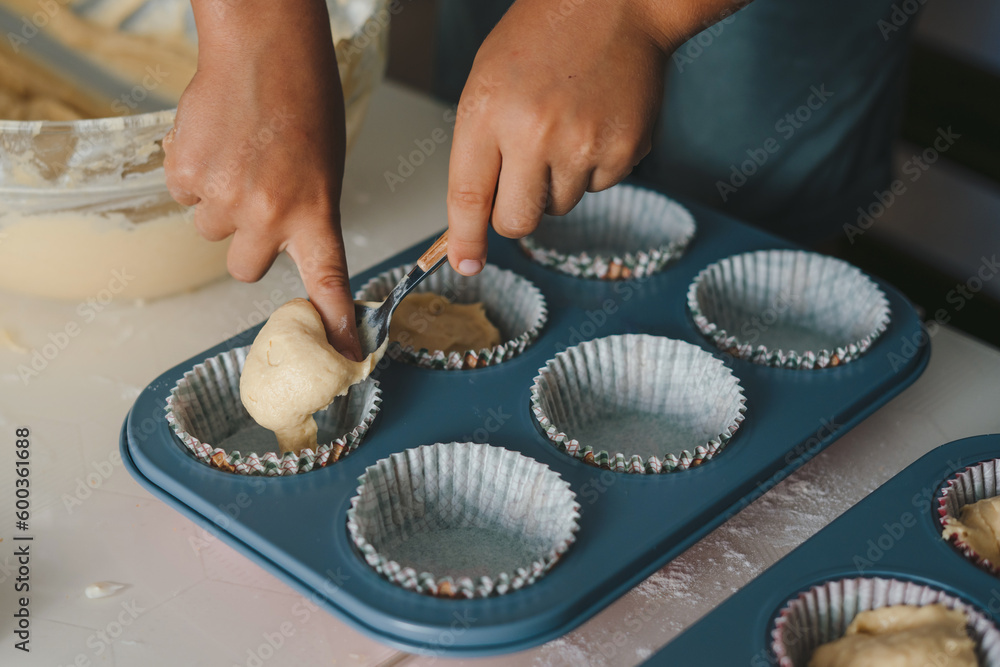 Close-up view of boy's hands filling cake pans with raw dough. Children helping parents. Homemade pastry.