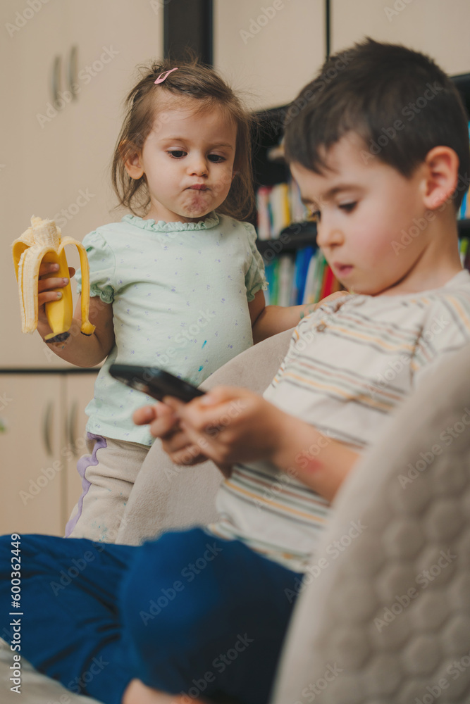 Baby girl eating a banana while watching her brother playing games on the phone. Internet technology concept. Communication concept. Education internet