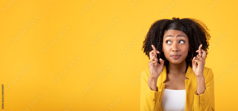 Pretty black lady crossed fingers for good luck, making a wish and looking at free space on yellow background, panorama