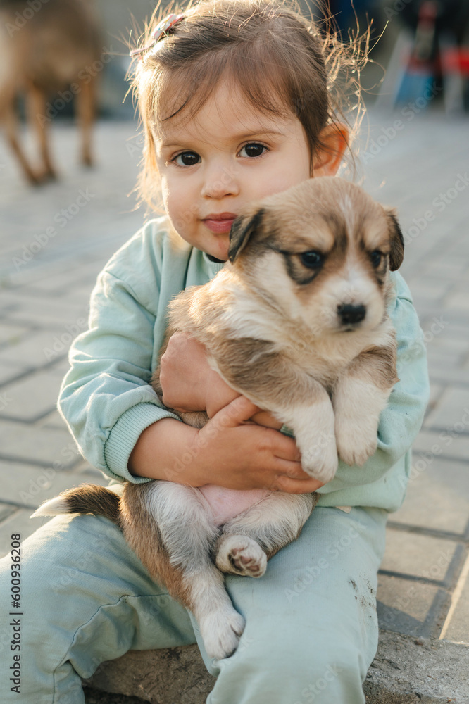Adorable cute little puppy petting in a lap of a baby girl owner, outdoors on a backyard on a spring day. Caring for animals.