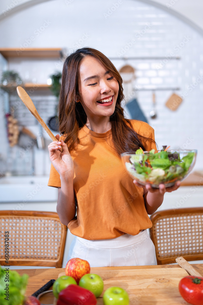 Beautiful young woman happy portrait cooking fresh organic clean food fruit at home modern kitchen