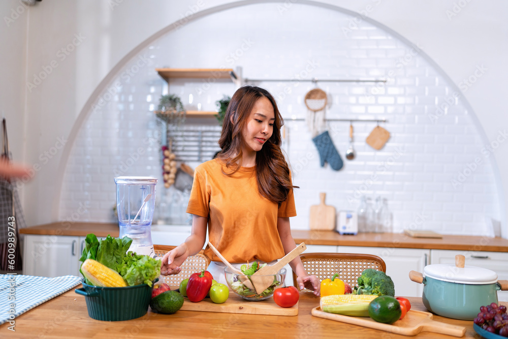 Beautiful young woman happy portrait cooking fresh organic clean food fruit at home modern kitchen