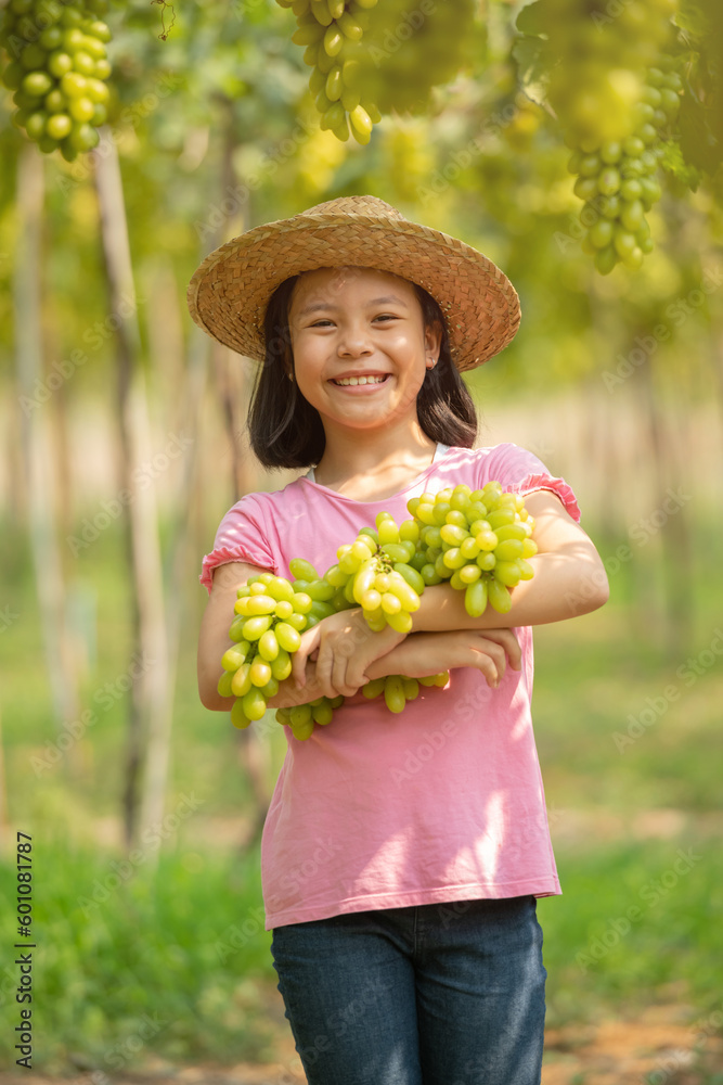 happy asian girl traveling backpacker, asian traveler standing in beautiful vineyards in autumn harvest with freshly grapes. Vineyards at sunset in autumn harvest. Ripe grapes in fall.