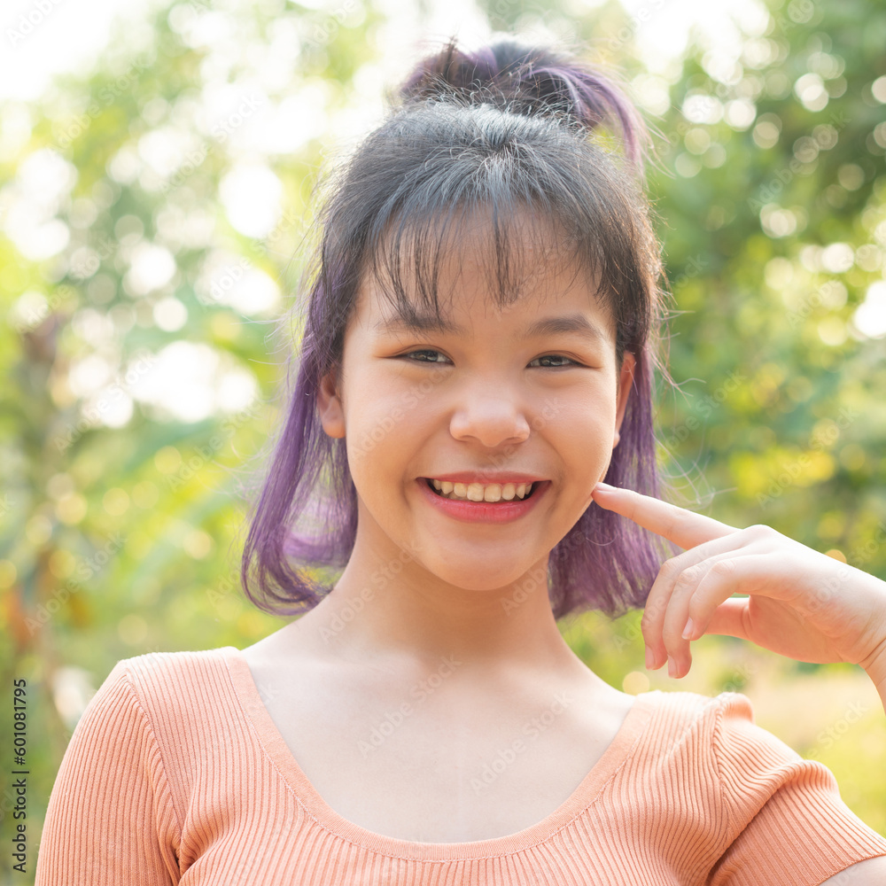 Happy teen girl 11-15 year old. Portrait of beautiful woman smiling with perfect smile at park during sunset. Smile face asian lady girl wear casual cloth standing finger touch cheek.