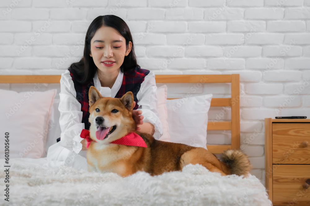 With a heart full of love and concern the beautiful asian woman finds solace in spending quality time with her beloved Shiba Inu dog on the cozy bed in their bedroom.