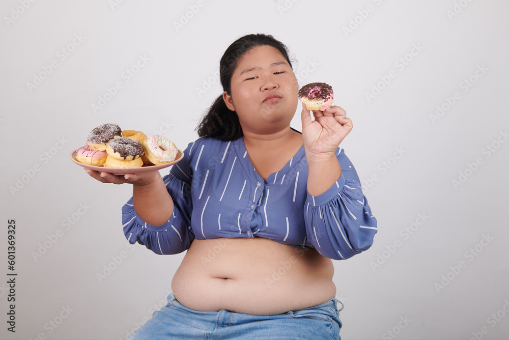 Happy fat woman eating donuts on plate isolated on color background. Food addiction, diet breakdown, eating disorders, depression, laziness problem eating, compulsive overeating concept.