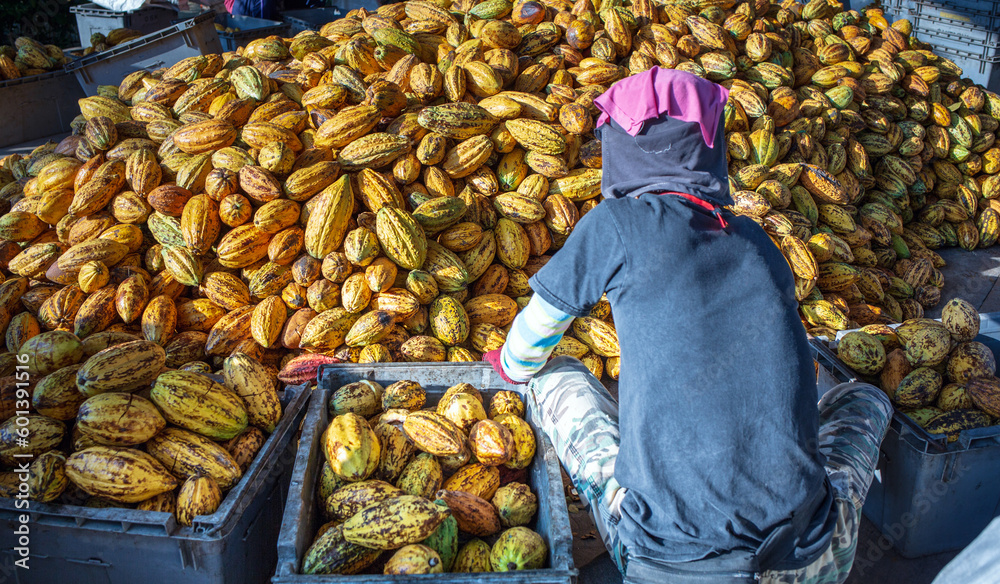 Back view of the working worker sorts fresh, ripe, yellow cocoa pods into a crate. Workers preparing fresh cocoa fruit before fermentation in the chocolate factory
