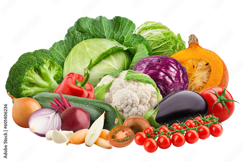 Heap of fresh vegetables, isolated on white background, full depth of field