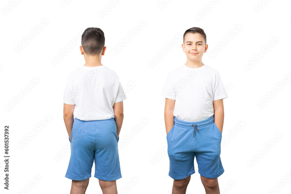 white t-shirt on a young boy, isolated, front and back view, hands pockets