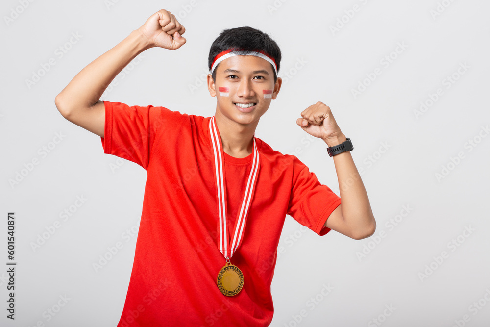Young Indonesian man holding gold medal celebrate Indonesia independence day 17 August isolated on white background. Dirgahayu 78 Tahun Kemerdekaan Indonesia.