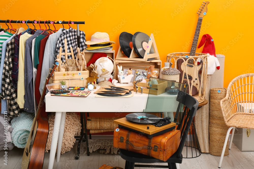 Many different stuff near orange wall indoors. Garage sale