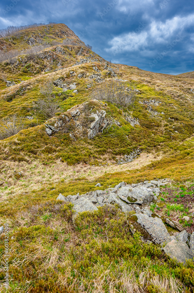 Early spring landscape of Połonina Wetlińska with the Mount Roh in the Bieszczady Mountains.
