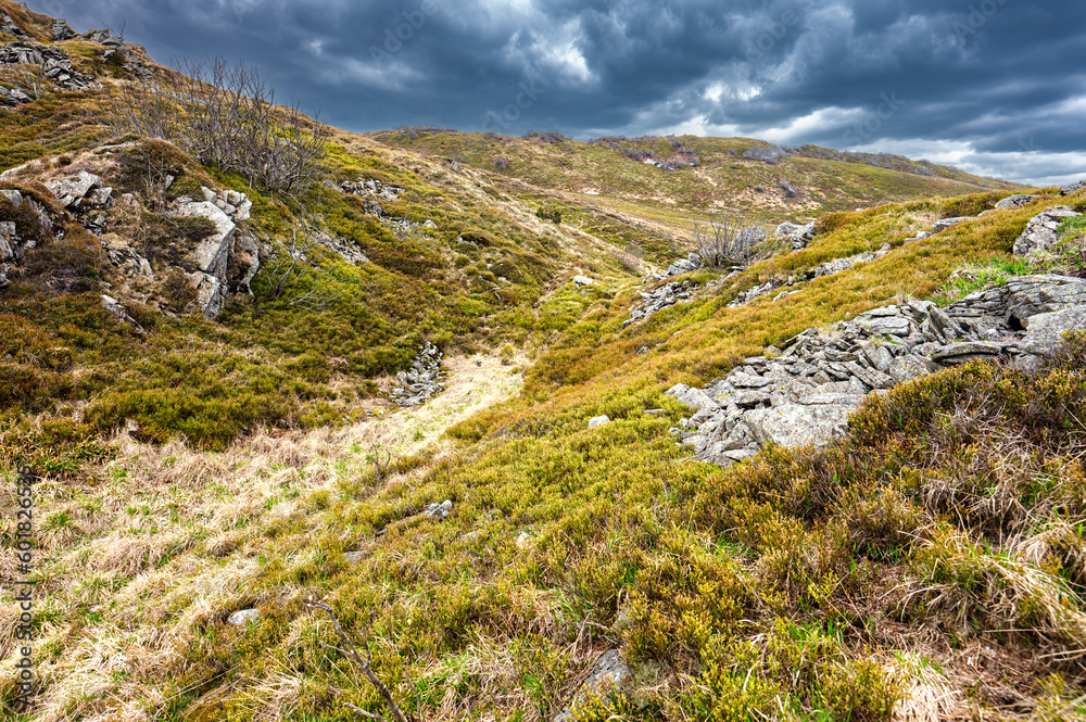 Early spring landscape of Połonina Wetlińska with the Mount Osadzki Wierch in the Bieszczady Mountains.