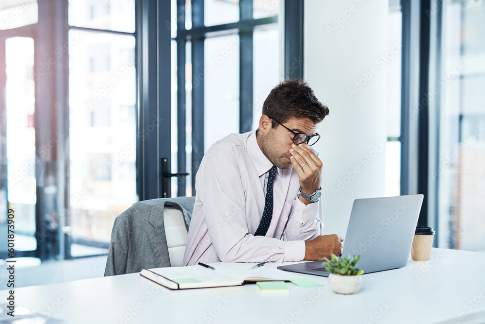 Headache, stress and man on laptop in office frustrated with glitch, mistake or crisis. Anxiety, vertigo and male business person angry with failure, 404 or bad review, deadline report or burnout