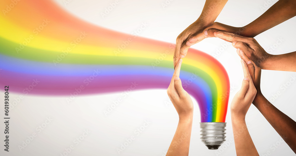 Symbols and shapes of light bulbs created by hand. Inspirational idea unity and creative team for creativity thinking together as a diverse group of people together. concept of idea, creative solution