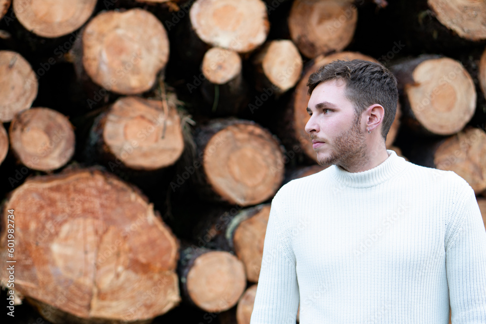 Young boy together to some stacked wooden logs. Concept deforestation, industry, wood, nature.