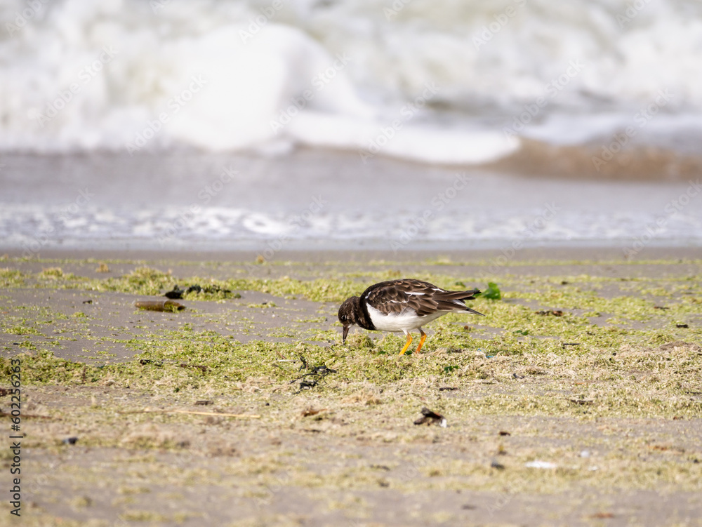 Ruddy turnstone, Arenaria interpres, adult in non breeding plumage checking seaweed on beach of Scheveningen, Netherlands