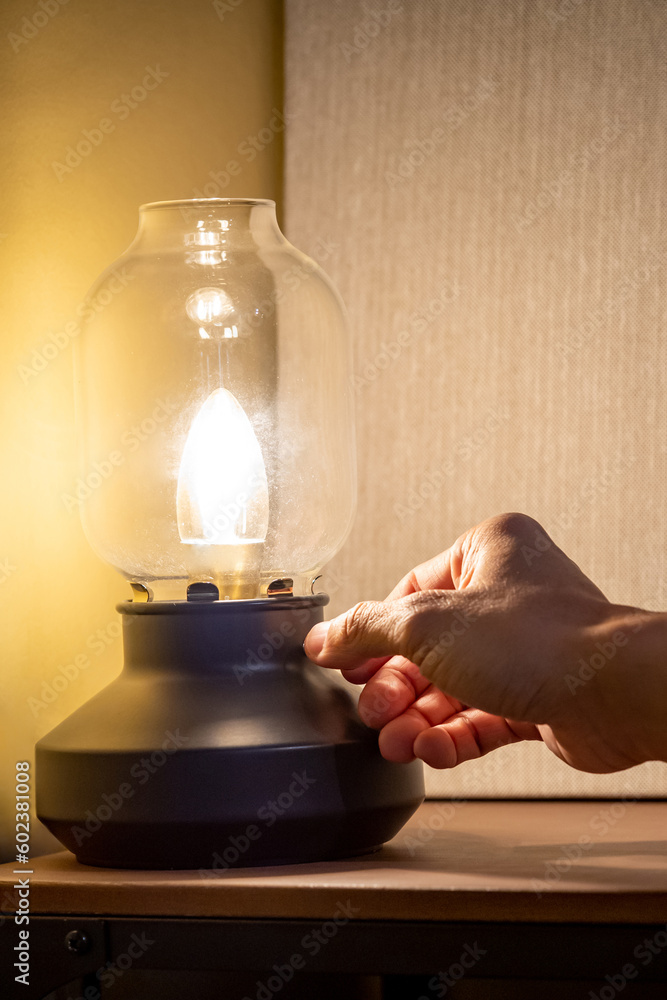 Male hand turns on vintage lantern lamp switch on wooden table in the dark room. Lighting equipment for home decor