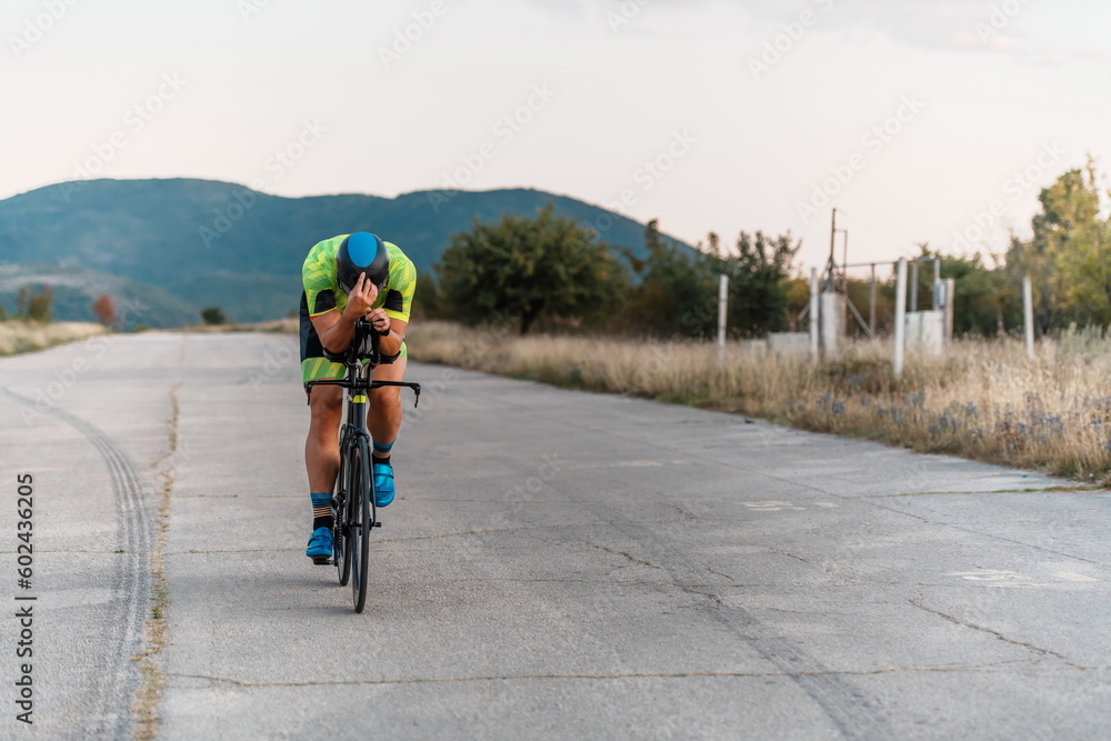 Triathlete riding his bicycle during sunset, preparing for a marathon. The warm colors of the sky provide a beautiful backdrop for his determined and focused effort.
