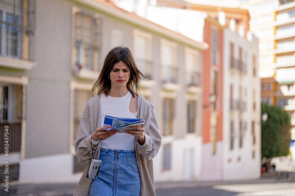 Traveler girl searching right direction on map, travel, freedom and active lifestyle concept