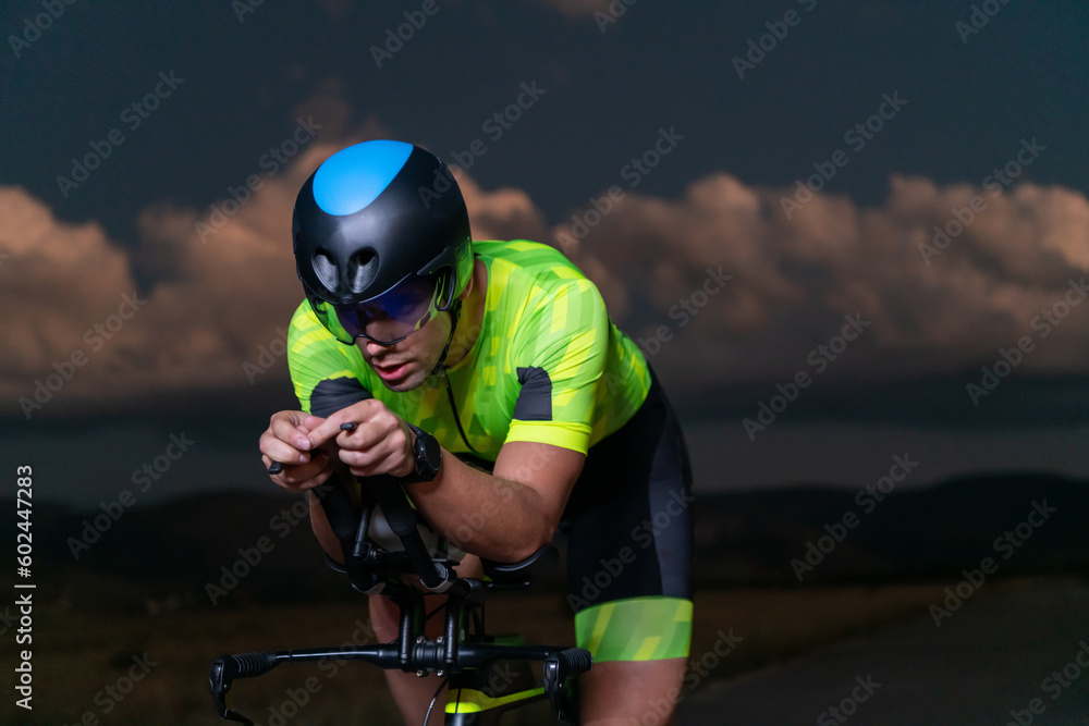A triathlete rides his bike in the darkness of night, pushing himself to prepare for a marathon. The contrast between the darkness and the light of his bike creates a sense of drama and highlights the