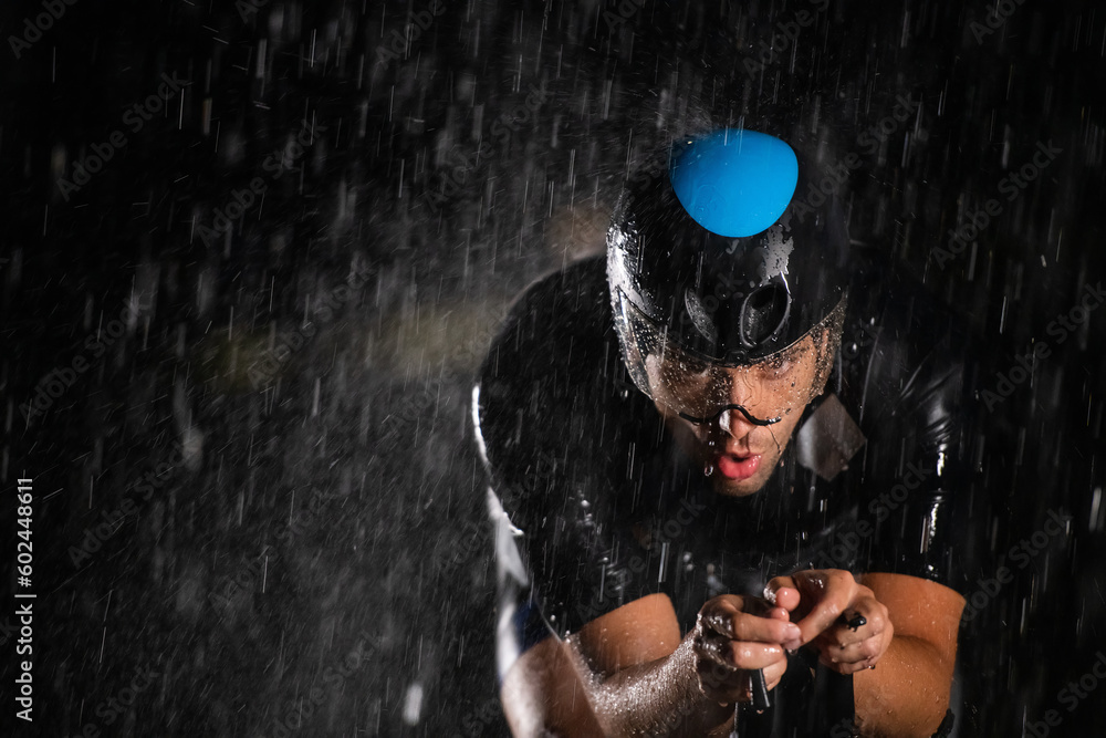 A triathlete braving the rain as he cycles through the night, preparing himself for the upcoming marathon. The blurred raindrops in the foreground and the dark, moody atmosphere in the background add