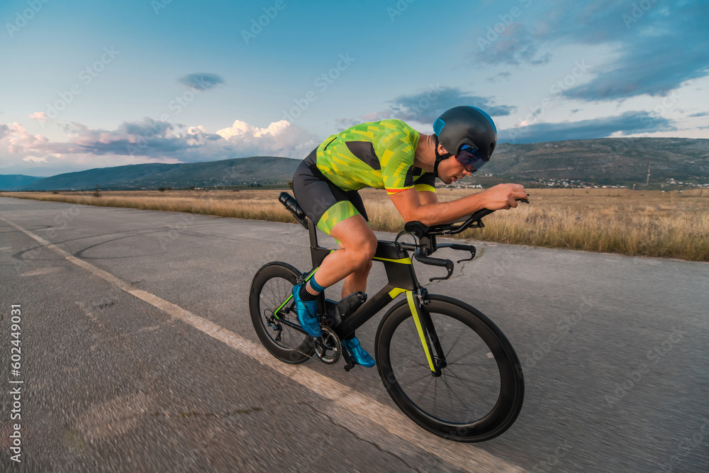 Triathlete riding his bicycle during sunset, preparing for a marathon. The warm colors of the sky provide a beautiful backdrop for his determined and focused effort.