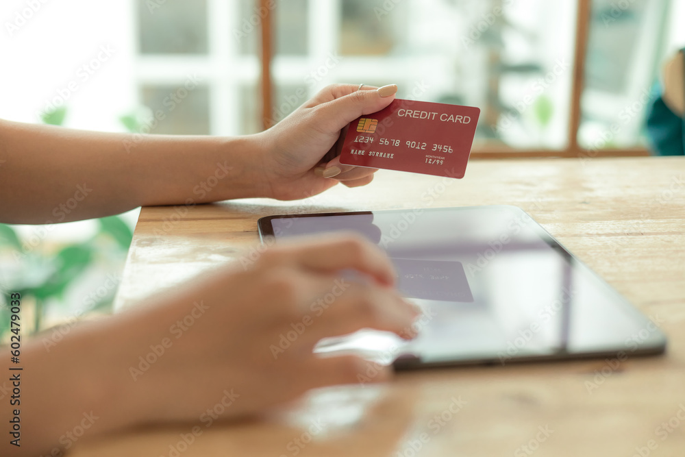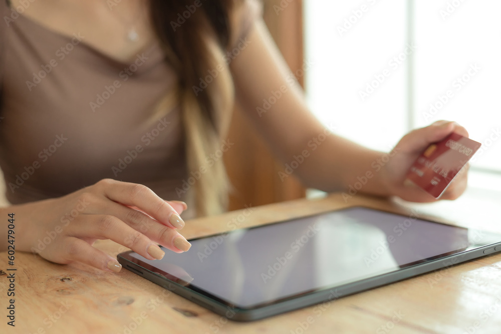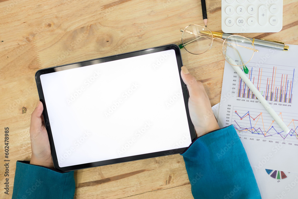 Close up of womens hands using tablet with empty screen on desk, Image taken from above
